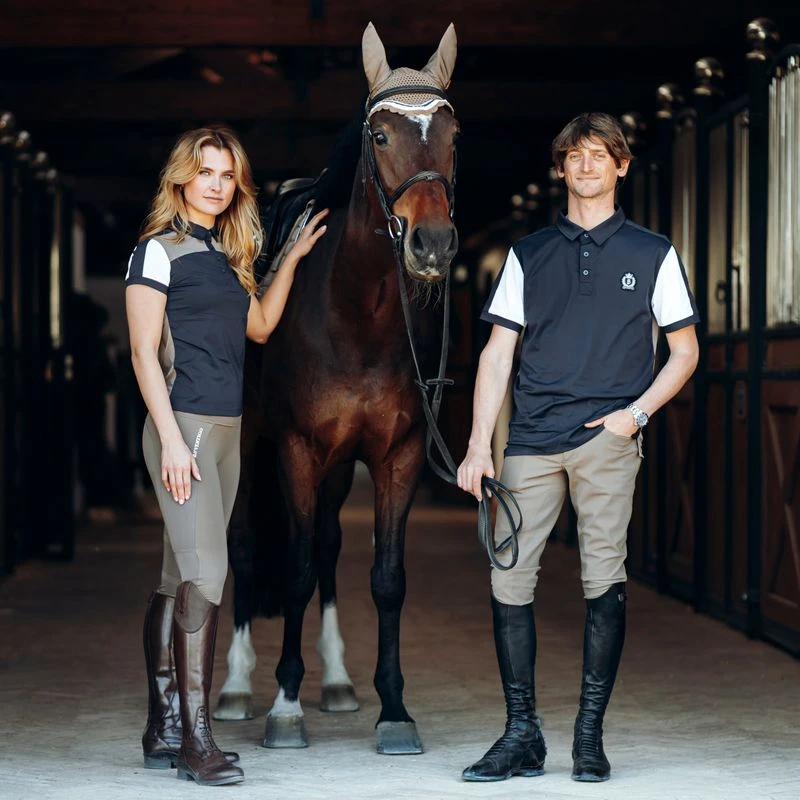 Our B Vertigo Alec polo shirt is made from breathable piqu fabric that feels soft and cooling on the skin. The contrasting colors look unique, but the classic combinations will easily fit into your riding wardrobe. Short sleeves and button closure prevent you from overheating. Wear this polo shirt riding, in the stables or in your free time for a cool look. Also available in women’s cut (#33591).
