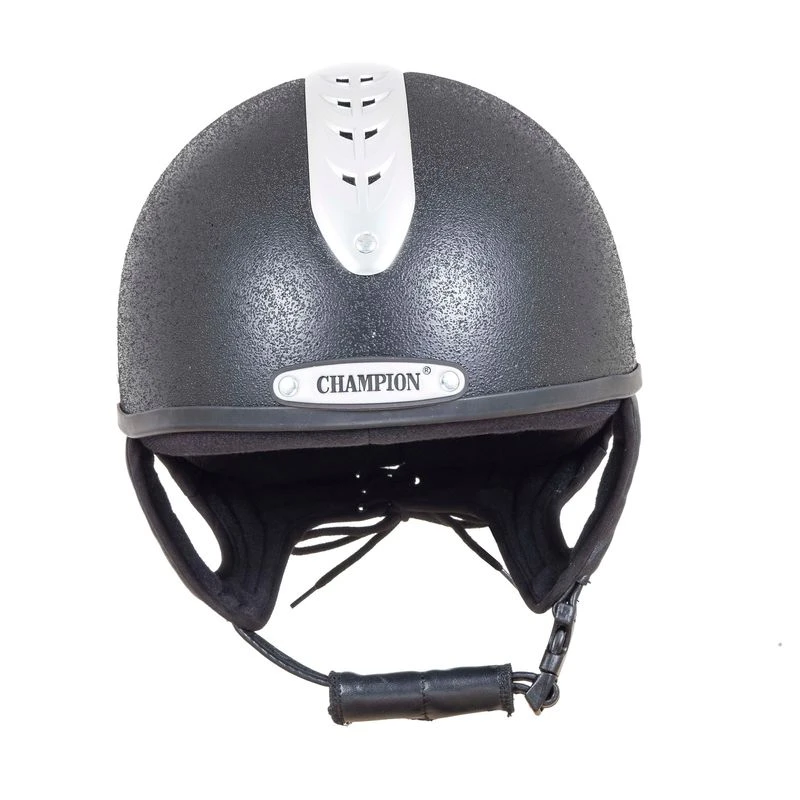These helmets are handmade in Great Britain. They have a low profile lightweight fiberglass shell. There is a highly ventilated airflow system. The durable painted acrylic with sanded finish is good looking and will last and last. The crown is padded in breathable high tech microfiber. Four point padded soft leather harness with rear lacing for fit and comfort. Interior is lined with with brushed nylon.