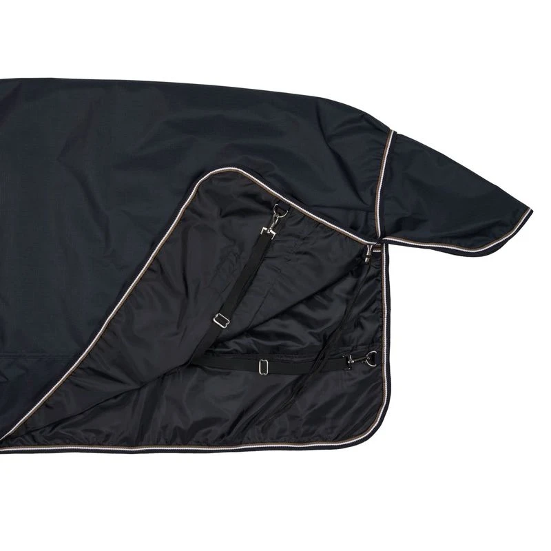 This rug is made from a waterproof, breathable fabric. The good fit at the neck and shoulder area makes it comfortable, and the high gusset allows lots of movement. The front buckles, X-surcingles, legstraps and tailflap secure the turnout.