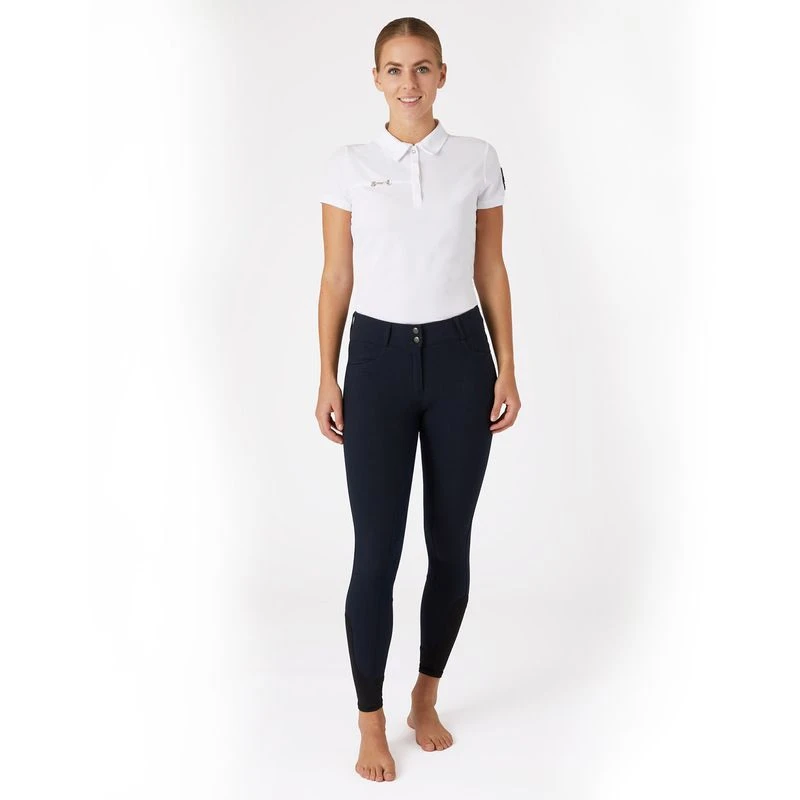 These high waisted breeches are equipped with a leather full seat. They are designed in muted colors to easily match your riding wardrobe. Crystals on the back pockets bring a touch of bling to your outfit.