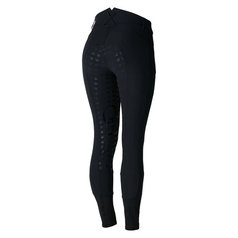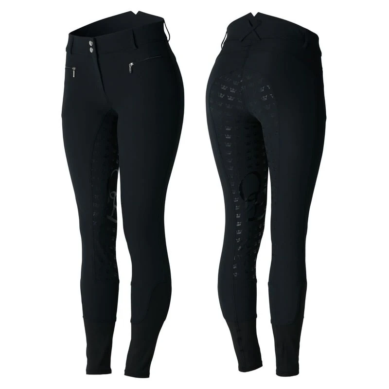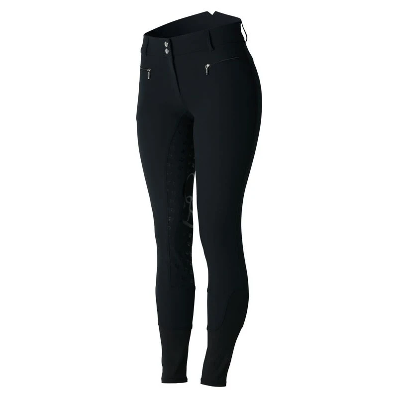 The Women’s Melody Full Seat High Waist Breeches are comfortable and stylish breeches. These high waist riding pants include a silicone print in a fun pattern which adds grip where you need it most. The crisscross belt loops make these women’s breeches a great choice for schooling. Two front zipper pockets hold keys or treats and the elastic lower leg offers comfort under tall boots. Melody Full Seat Breeches are designed with a front zipper and are made from breathable fabric that is slightly stretchy for added comfort in the saddle.