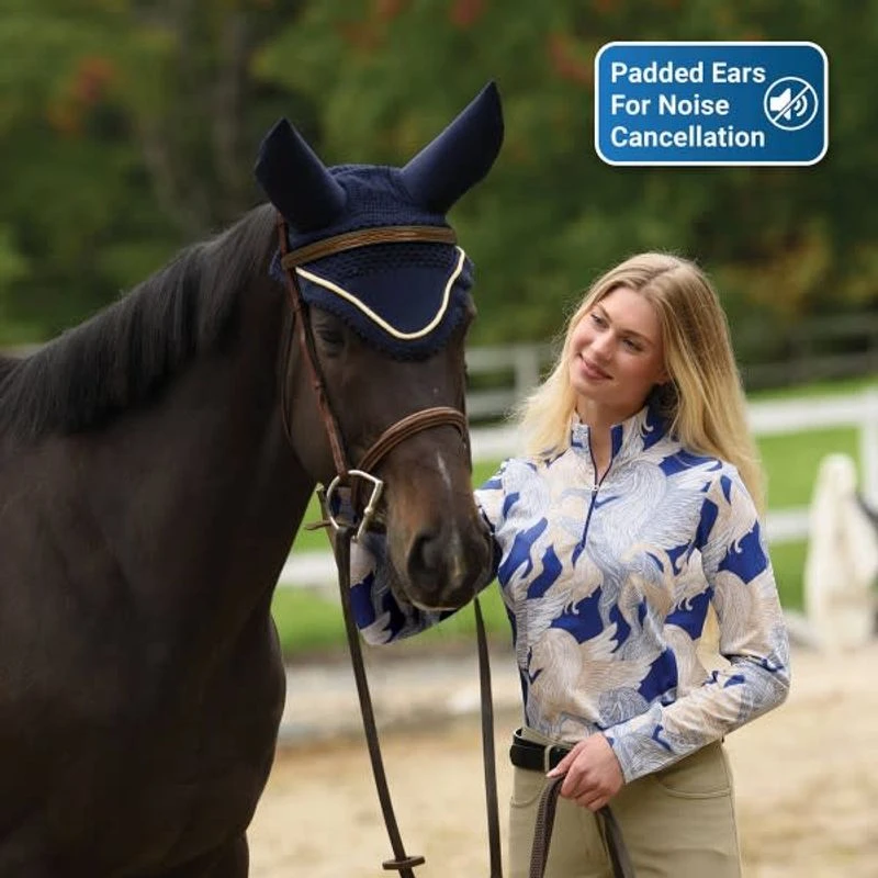 This traditionally styled and colored ear bonnet has padded ears to help soften ambient noise. Can help nervous horses be less reactive.