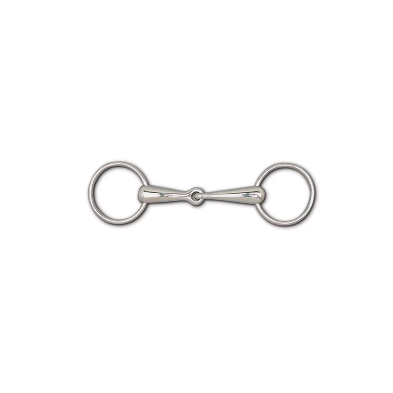 This bit has loose ring cheeks and a single joint hollow mouth.